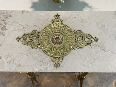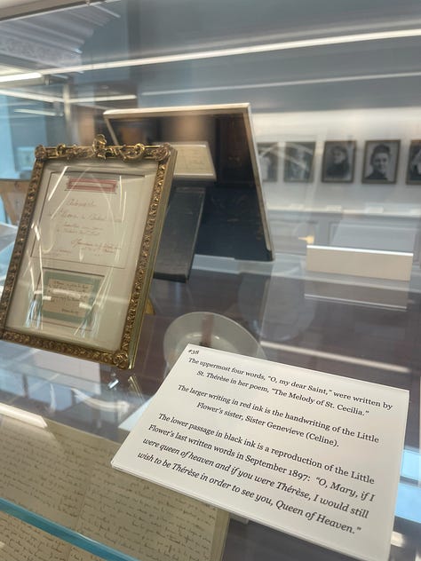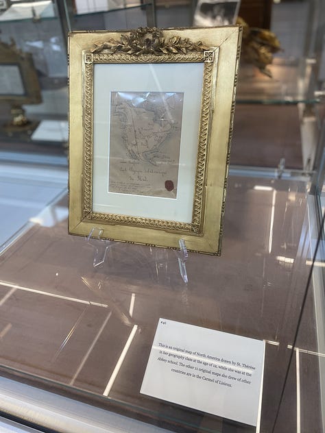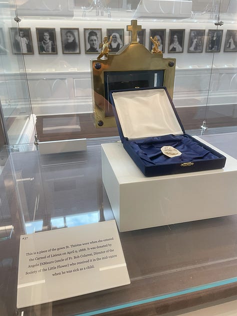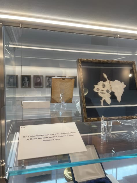 On Friday, May 16, I arrived at the small museum when it opened at 10:00 am, and took my time strolling around looking at such gems as Thérèse’s First Communion prayer book from 1884; a map of North America drawn by Thérèse at age twelve in 1895; a piece of the gown she wore when she entered the Carmel of Lisieux in 1888; a piece of the habit she wore for her profession of vows in 1890; two scraps of paper with Thérèse’s actual handwriting; and many more items (See the video tour and photos at the end of this article to get an immersive feel for the space). But, most of my time was spent praying in front of a beautiful golden reliquary which housed five different relics of Thérèse, each encased in its own golden rose. This reliquary was surrounded by a strikingly massive wood carving featuring key scenes from Thérèse’s life which must have been more than thirty feet wide. The Shrine’s website states it is the “largest wood carving of a religious nature in the United States.”