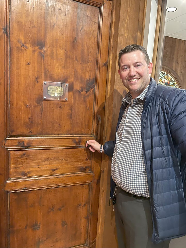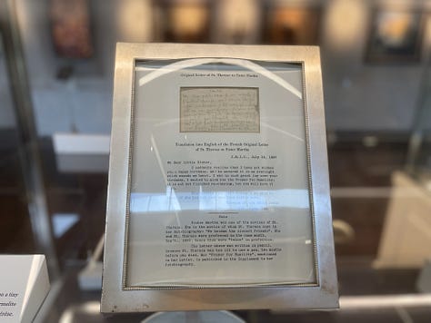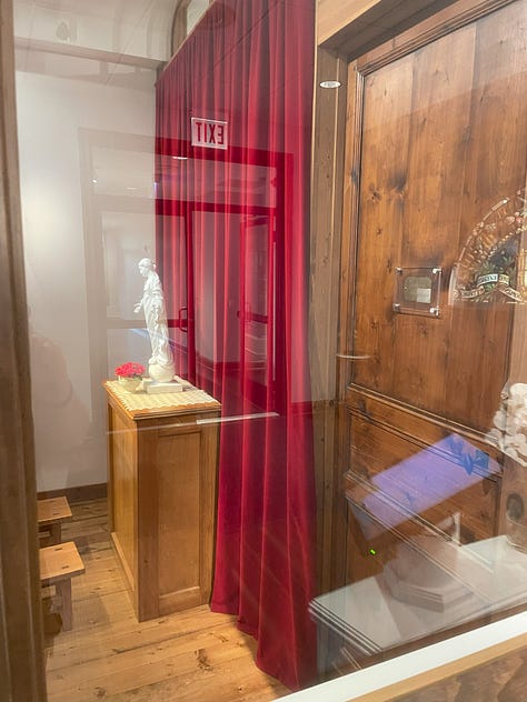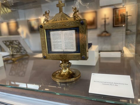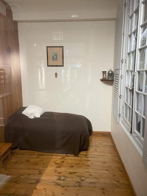 After Mass, I walked back across the parking lot to the museum, and read Story of a Soul in front of the large golden reliquary for about an hour. I then walked back through the gift shop, and one of the workers said, “Let me introduce you to our business manager. Maybe he can help.” She led me to a gentleman in the back office on the other side of the building, to whom I explained that I understood there were no group tours available, but if an opportunity to see the cell replica became available, he could find me praying in front of Thérèse’s relics for the next several hours until they closed for the day at 4:00 pm. At 3:00 pm, he found me praying and asked, “Will you be here at ten o’clock tomorrow morning? Fr. Bob Colaresi will meet you.” I expressed my gratitude, confirmed I would be there, and informed my advocate in the gift shop of this amazing development. She rejoiced with me, but I could also sense some surprise on her face. I said, “Is it rare to have a private tour with Fr. Bob?” She said, “Fr. Bob is out of town a lot traveling related to St. Thérèse; he was the director of the Shrine and the Society of the Little Flower from 1992 to 2020; and he presided over the U.S. tour of Thérèse’s relics in 1999-2000. So, that’s pretty special!”