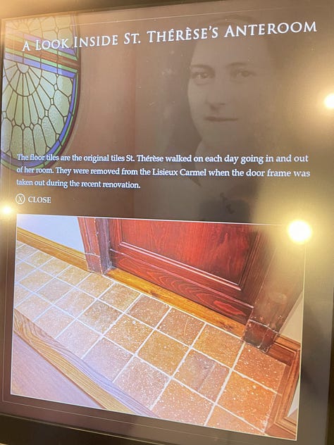 I met Fr. Bob the next morning, on May 17, the 100th anniversary to the day of Thérèse’s canonization, and we ended up talking for forty-five minutes about Thérèse, a mere twenty feet from her relics and the surrounding wooden tableau of her life. He later told me it was a refreshing meeting for him because the biggest question most Shrine visitors have is, “Why did Thérèse send me a pink rose instead of a red one?” Then, he said, “So, you wanted to see her cell?” He led me to the thick, white, wooden gate surrounding the entrance to the cell, and presented his key. As we walked forward, into the replica of the anteroom where Thérèse would meet with novices, he began to tell me about how he came into possession of the original door frame, a section of original floor tiles, and the original door to Thérèse’s third cell in which she wrote her famous autobiography Story of a Soul. He visits Lisieux often to lead pilgrimages, and has frequent contact with the archivist of the Carmel of Lisieux. It happened that during a needed renovation for safety reasons, the tile and other items had to be removed, and it was at this juncture the items were offered to Fr. Bob to bring back to the States for public veneration at the Shrine.