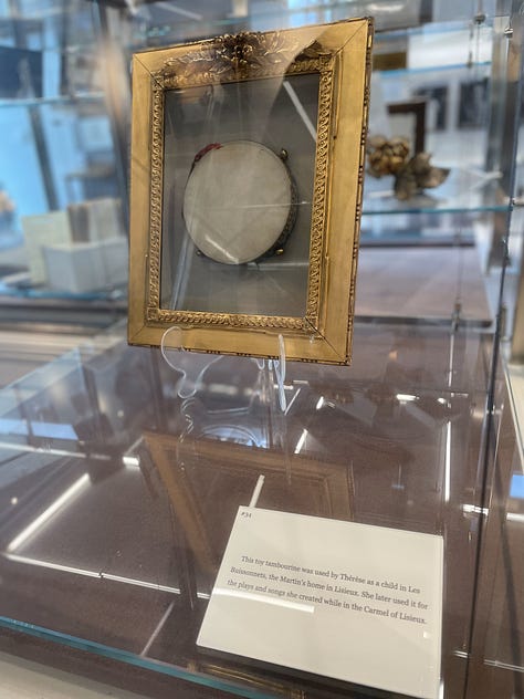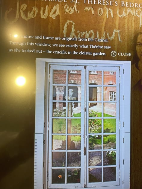 Fr. Bob then said, “I have to head to a meeting, but I’ll be back to get you in fifteen minutes.” Then, I had an opportunity to pray sitting on a small stool with the bed a few inches to my left, and the original cell door about a foot to my right — sitting in a spot with the identical view that Thérèse would have had writing Story of a Soul. They even had a large photograph in the window frame of the view Thérèse would have had of the courtyard from her cell! In that moment, I sensed that Thérèse was saying, “Remind the Church that the spiritual life is so simple. It all comes down to surrender. If you miss that, you miss everything.”