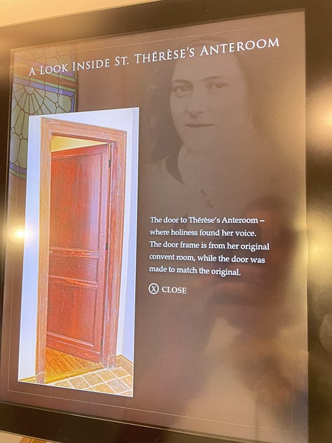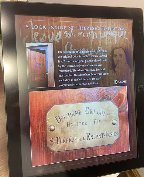 As I got up to head to daily Mass around 11:00 am, I noticed a full size exact replica of Thérèse’s cell with plexiglass windows that allowed you to peek inside (a ‘cell’ is how those in monastic life refer to their small, modestly appointed living quarters) with a sign that noted there were some second class relics inside, including the original door to Thérèse’s cell. However, much to my dismay there was no access to the cell. I inquired at the museum’s gift shop whether I could request a private tour of the museum and the cell in particular. I was given a phone number to call, however the minimum size for group tours was twenty. Feeling rather discouraged at this news, I headed across the parking lot to the Shrine Church for Mass. My ‘prayers’ before Mass would more properly be classified as complaining to Thérèse about why I couldn’t get access to the cell replica. I sensed in my heart that Thérèse responded as follows. These are the exact phrases I wrote down in that moment: “How close do you want to be to me? I have a mission for you, and I pray for it, and for you. You are my little brother, my friend, and my co-missionary of the ‘way of confidence and love’. I will give you access you never thought possible, that you can’t even imagine — an All-Access Pass.”
